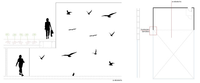 Hainbat saiakera egin ondoren, hurrengo ebaketa tipoa aukeratu genuen proiektua osatzeko abiapuntu bezala. Bertan, esan bezala, lehengaiak eta produktuak gordetzeko biltegia kokatzen da, fabrikarekin zuzenki lotua. Izan ere, bien arteko harremanak jarraia izan behar du. Fabrikak, bestalde, altuera gehiago hartzen du, erabilera aldetik beharrezkoa duelako, eta, era honetan, tarteko kotarekin lotzen da. Bertako galeriak, esan bezala, bolumenen arteko lotura estalia osatzen du, aldi berean, zerbitzuetarako sarrera emanez. Kota honetan kokatzen da, baita ere, langileentzako espazio publikoa edo barne plaza, galeriaren jarraipen bezala.