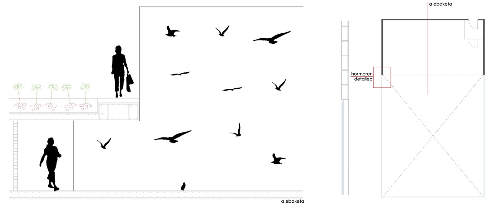 Suspertegiko zaintzapean egon behar duten animaliak eraikinen arteko kaiola batzuetan kokatu dira, era honetan inguruko jendearekin harremana sortzen da, helburuetako bat izan dena. Hegaztiek beharrezkoa dute zati estali txiki bat kaiolaren barruan, bertan janaria kokatzeko, esate baterako, baita animaliak bertan egon ahal izateko ere. Hau kontutan izanda kaiolaren alde estalia zerbitzuen solairuan kokatuko zen eta galeriaren altuera bera izango zuen. Itxitura era berean adreiluzkoa itabikez egingo zen zati honetan.
